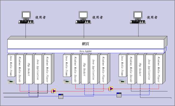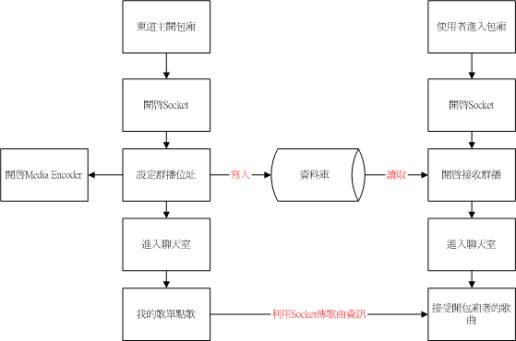 後端的PHP Socket和Java Application是為了讓開包廂的Master能夠傳送現在要點播的歌名給所有在包廂中的使用者。而利用Windows Media Encoder即時傳送的聲音會經由別位使用者的Media Player接受。