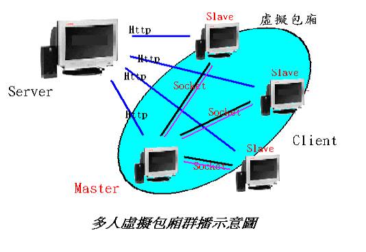 多人虛擬包廂是整個KTV系統中最難的一部份,除了要做到即時傳聲音之外,還要能讓所有的電腦都知道現在該下載那首歌,並且要達成聲音跟影像的同步,是我們花最多心思在規劃的地方,圖27是包廂如何運作的示意圖。Master跟Slave彼此之間除了用資料庫同時做初始化之外,還必須用額外的Socket隨時做溝通。其使用者操作流程如圖28所示。