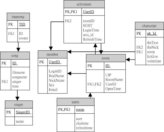 後端的資料庫除了要紀錄使用者的資料及動作之外,同時還儲存所有功能的各種設定,並透過網頁讀出後和其他程式做溝通,傳遞資料,最後再由網頁寫入,是整個線上KTV系統中的核心。其關聯性資料表如下圖所示: